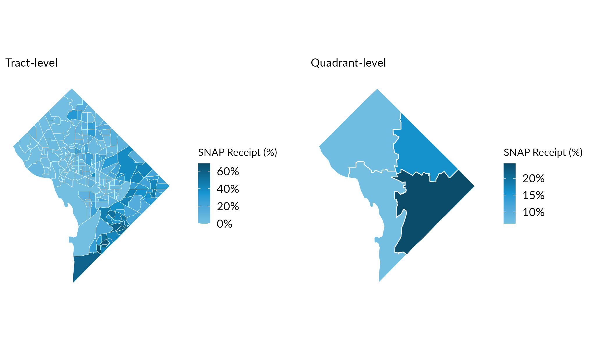 The maps below show the share of households receiving SNAP benefits. Notice how aggregating to quadrants produces more precise estimates with smaller margins of error.