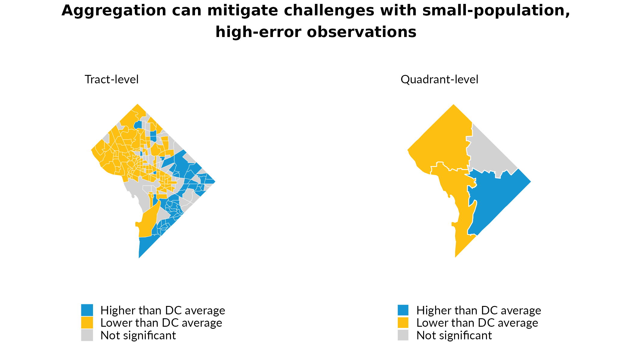 At the tract level, many tracts are not statistically significantly different as compared to the mean across all DC tracts. By aggregating our tract observations, we can detect statistically significant differences at greater geographic scales. This enables analysis for more policy-relevant areas and helps mitigate shortcomings associated with high measures of error for smaller-population observations.